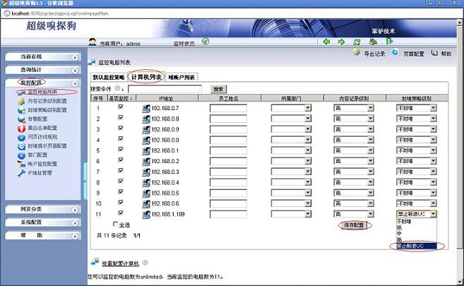 2. 在“监控配置--> 监控电脑列表--> 计算机列表”中应用封堵规则,如下图所示: