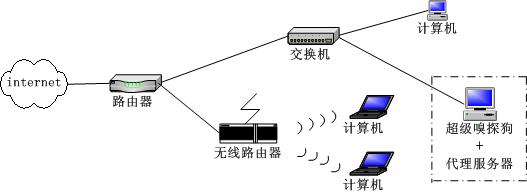 将网络中的某台有线电脑作为代理服务器,所有的无线电脑通过这台有线的服务器连接互联网。连接方法如下图所示: