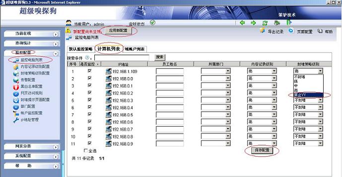 (2)在“监控配置-- >监控电脑列表-- >计算机列表”中应用封堵规则,如下图所示: