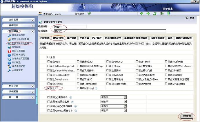 (2)打开超级嗅探狗,在“监控配置-- >封堵策略级别配置-- >编辑-- >禁止YY”,配置如下如所示: