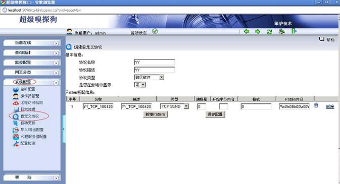 (1) 在“系统配置->自定义协议”中点击“ 新增自定义协议”增加一个自定义协议,命名为YY,协议类型选择“聊天软件”,如下图所示: