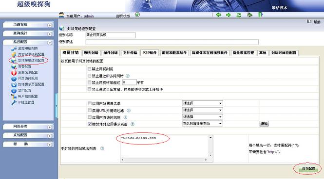 为此,超级嗅探狗的“封堵策略配置”中提供了一个“不封堵的网站域名列表”功能,此列表中的网站不受任何其他策略的影响,也不会被禁止掉。