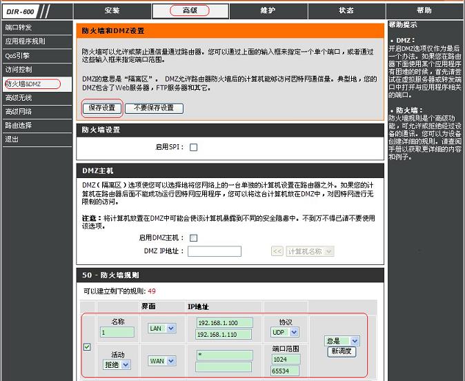 1. 首先登陆路由器,在“高级- - >防火墙&DMZ”里面对防火墙进行设置,具体设置如下图所示: