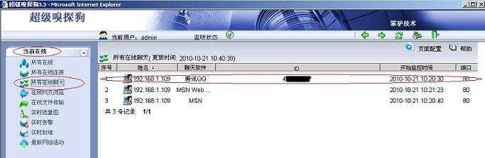 3. 接下来可以打开超级嗅探狗“当前在线- - >所有在线聊天”如果禁止生效;QQ会自动转换成TCP 80或者443端口进行通讯;如果QQ使用8000端口进行通讯,说明UDP端口没有禁止成功。QQ通讯协议可以参考:QQ通讯协议介绍。