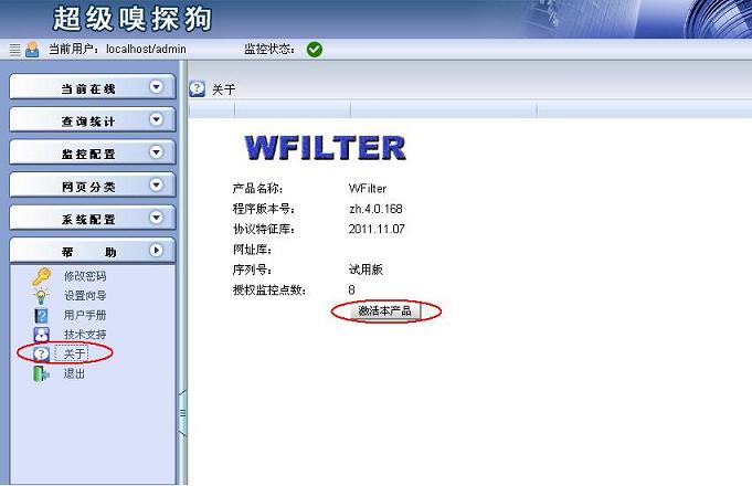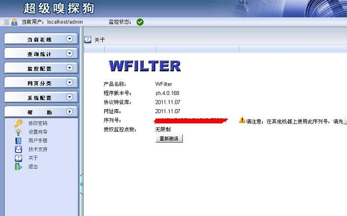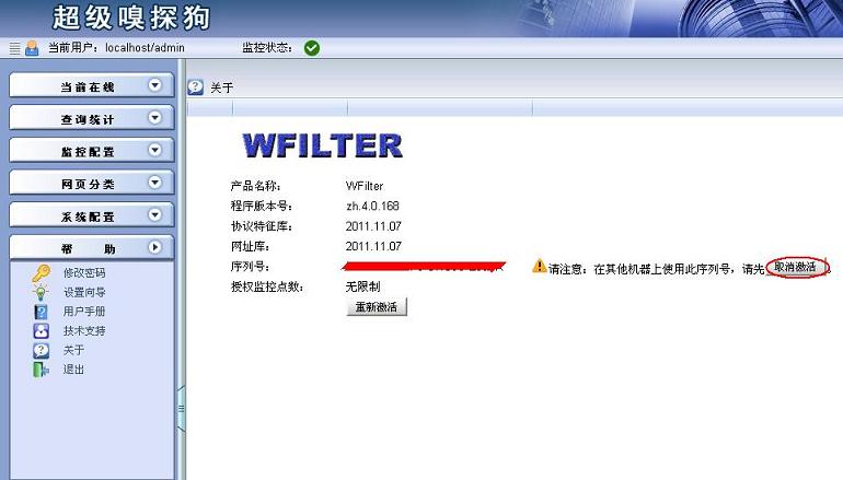 如果您选择通过Internet来激活您的产品,当您提交您在购买时获得的注册码时,激活平台将检查您的Internet连接,然后连接到一个安全的服务器上,传输您的注册码给WFilter,WFilter将返回您的注册结果,即而完成激活。