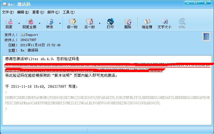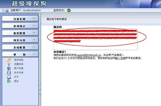如果您选择通过邮件的方式来激活您的产品,在对话框中输入您购买时获得的注册码,选择邮件激活,点击确定,页面将返回一串激活码,将激活码的内容通过邮件的方式发送到指定的邮箱中,公司将在两个工作日内将验证码发给您,把收到的验证码输入到系统,即可完成激活。