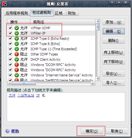 4. 参照之前的第2,3步骤将规则“WFilter-ICMP”添加,并将两个规则勾选后点击“确认”按钮