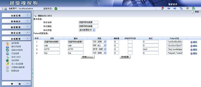 1)类型:TCP SEND 格式:0 Patten内容:^\x10\x00\x00\x00\xe5\xd9\x27\x4c 2)类型:UDP ALL 格式:0 Patten内容:^[\x12\x13]\x27\x00\x00[\x00-\xff]{3}\x00$ 3)类型:HTTP SEND 格式:Host Patten内容:.*jsq\.(xunlei|gigaget)\.com 4)类型:TCP SEND 格式:0 Patten内容:.*request.*userid.*peerid.* 其他相关信息可随意填写,但要注意Patten内容一定不能书写错误。最后保存配置。3.添加相应的封堵策略