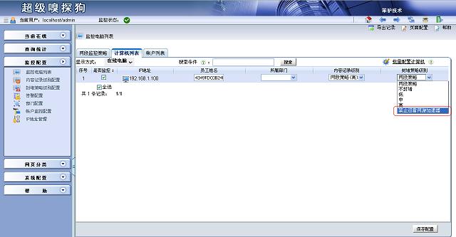进入监控配置 -> 监控电脑列表。对需要禁止的电脑进行配置,选择“封堵策略级别”为“禁止迅雷网游加速器”,最后保存配置并应用新配置。这时迅雷网游加速器就无法为任何网游加速了,也就代表该软件已经被封堵成功。再把想要封堵的网游加入到封堵策略就可以了。