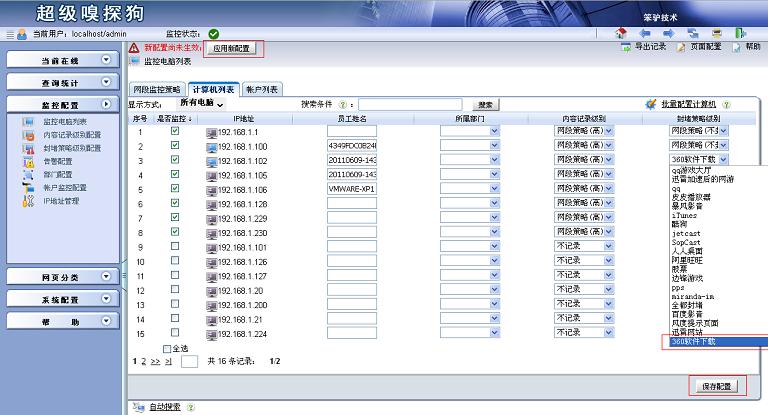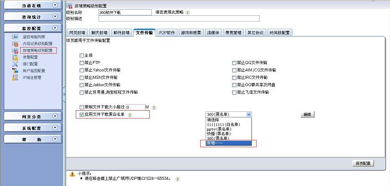 3. 后退后再次“保存配置”,在监控电脑列表中为相应的电脑选择刚才设定好的封堵策略,保存配置,应用新配置。