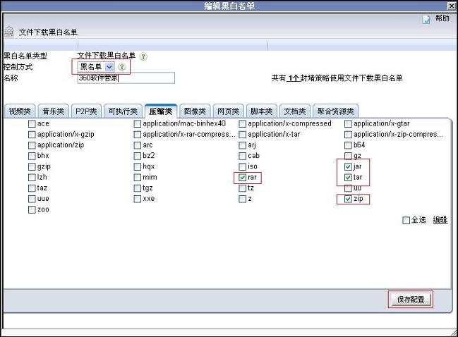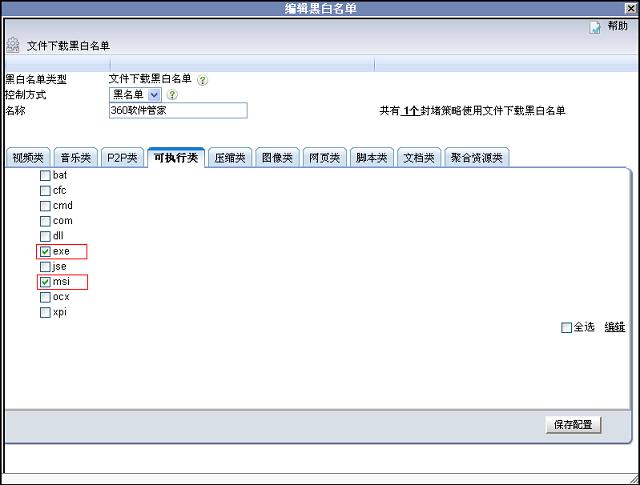 2. 在黑白名单对话框中选择控制方式为“黑名单”,在可执行类选择exe、msi,在压缩类选择jar、rar、tar、zip。最后单击“保存配置”