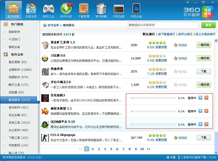 4. 这时,该电脑使用360软件管家下载安装软件就会被自动禁止(软件下载被自动暂停)。