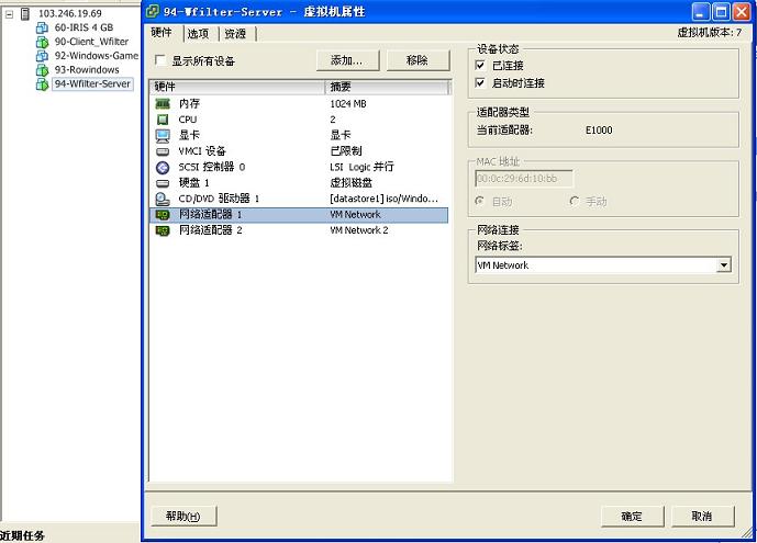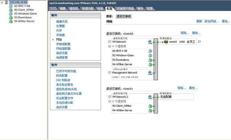 这样,桥接监控虚拟机“94-wfilter-server”上的两块网卡,并且安装WFilter,然后设置WFilter工作在“串联模式”即可监控vSwitch1上的所有虚拟机的上网行为。WFilter的具体配置步骤,请参考:通过网桥部署超级嗅探狗进行监控