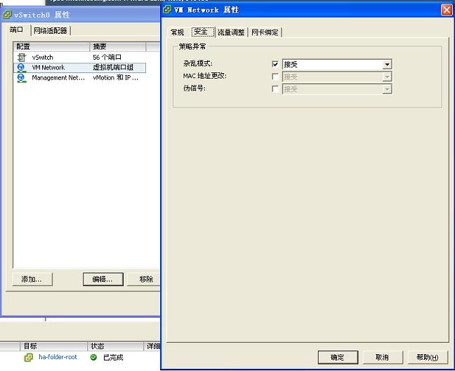 步骤3,监控主机所在两块网卡连接的虚拟交换机都要允许“杂乱模式”