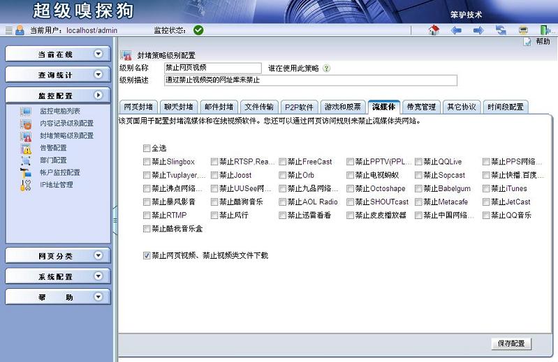 首先,您需要在监控配置->封堵策略级别配置中,新增一个封堵策略级别,取名为“禁止网页视频”,在网页封堵选项卡中,勾选流媒体中的“禁止网页视频、禁止视频类文件下载”,单击“保存配置”。具体如下图所示: