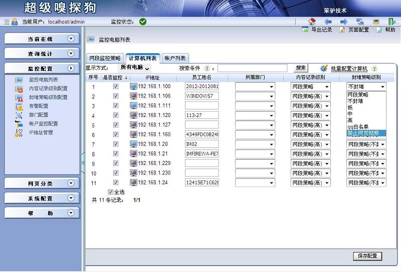 然后,在监控配置->监控电脑列表中,对需要禁止其访问视频网站的电脑使用该封堵策略即可。具体如下图所示: