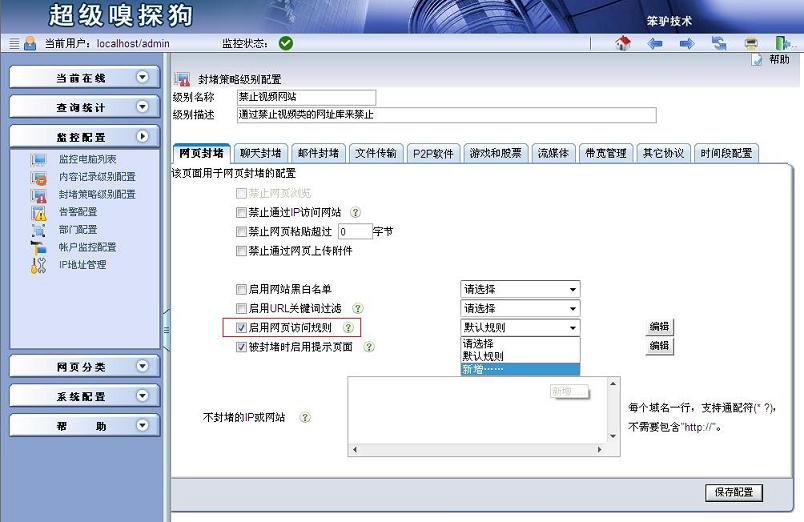 首先,您需要在监控配置->封堵策略级别配置中,新增一个封堵策略级别,取名为“禁止视频网站”,在网页封堵选项卡中,勾选“启用网页访问规则”,并在后面的下拉列表中,点击“新增”。具体如下图所示: