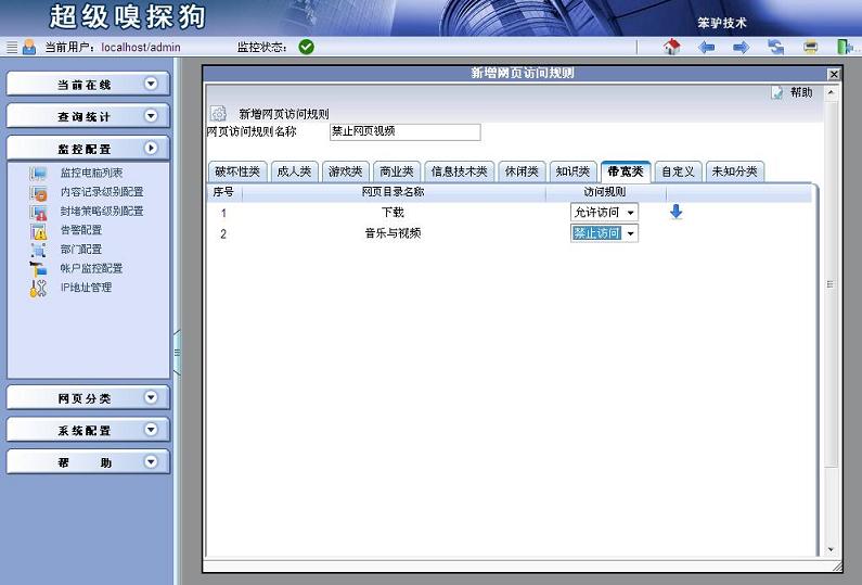 弹出的“新增网页访问规则”界面,名称为禁止网页视频,选择“带宽类”选项卡,将音乐与视频设为禁止访问,点击“保存配置”。具体如下图所示: