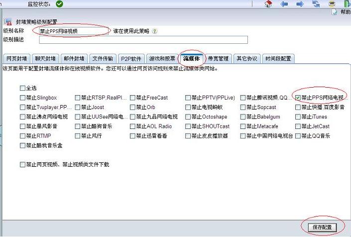 1.先新建一个封堵策略,名为“禁止PPS”,选择“流媒体”,勾选“禁止PPS网络电视”,保存设置。