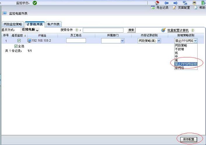 2.在“监控电脑列表”中配置你想禁止的移动设备的IP策略为“禁止PPS”,保存设置,应用新配置。