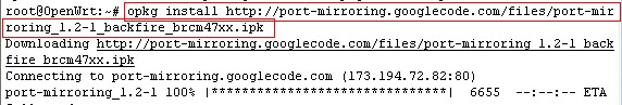 2. 安装port-mirroring程序:输入[FONT-COLOR=Blue]opkg install http://port-mirroring.googlecode.com/files/port-mirroring_1.2-1_backfire_brcm47xx.ipk[/FONT-COLOR]