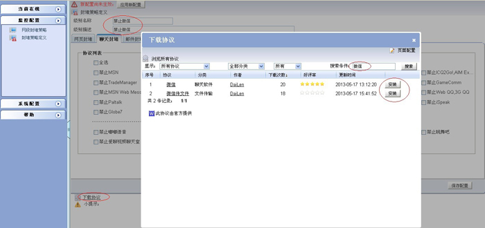 新建一个封堵策略,名为“禁止微信”。点击左下方的“下载协议”,弹出“下载协议”框,搜索微信和微信传文件并安装。