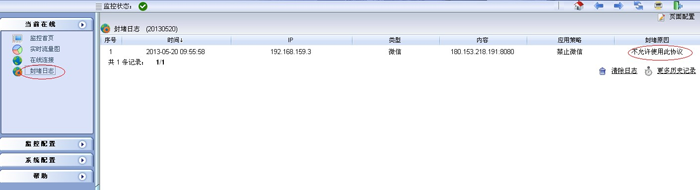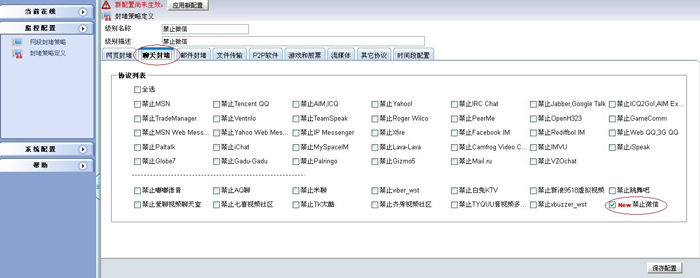 选择“聊天封堵”,将“禁止微信”前面的勾勾上,然后选择“文件传输”,将“禁止微信传文件”前面的勾勾上,点击保存配置。