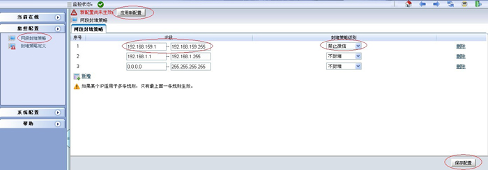 在“网段封堵策略”里,配置你想禁止的IP段的封堵策略级别为“禁止微信”,保存配置并应用新配置。