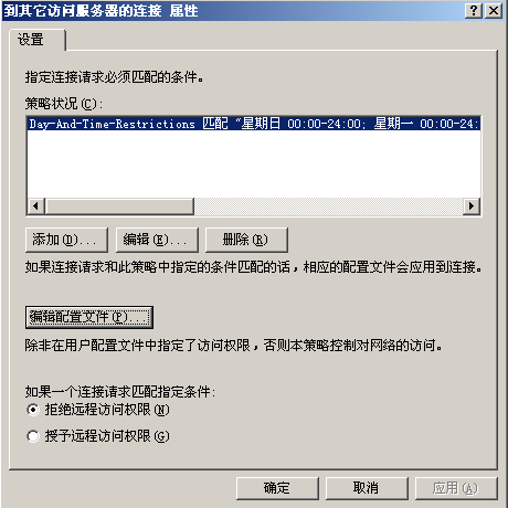 进入到远程访问策略,右击系统自带的远程访问策略,点击属性,在属性页面中点击编辑配置文件。([FONT-COLOR=Red]注:系统自带两个访问策略,都要设置。[/FONT-COLOR])