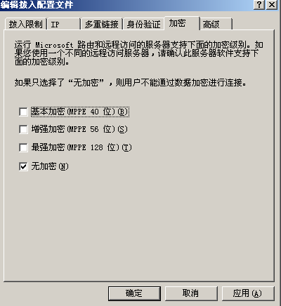 在编辑拨入配置文件页面中点击加密选项卡,去掉加密,选中“无加密”。