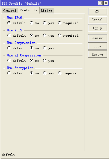 用winbox进入ROS,选择PPP中Profiles,点击Protocols,去掉压缩加密后保存并重启ROS服务。