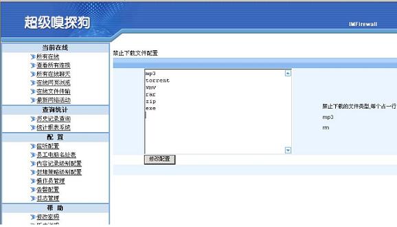 如果是要禁止从网页上面下载文件,需要在超级嗅探狗的封堵级别里面启用“下载文件控制”,然后把不允许下载的文件类型添加在“下载文件控制”列表中。如下图所示: