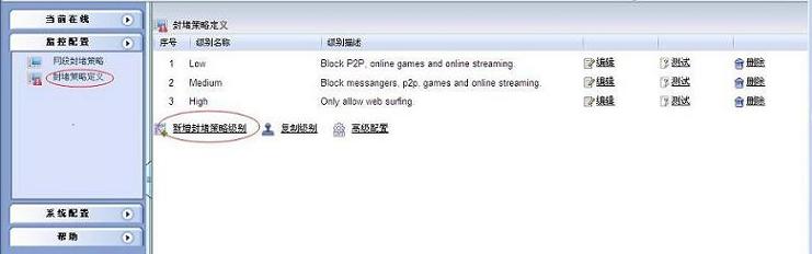 打开WFilter Free进入到监控配置 -- 封堵策略定义,点击新增封堵策略级别。