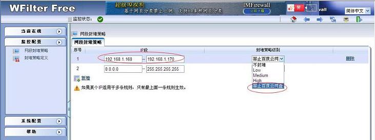 进入到监控配置 -- 网段封堵策略,点击新增,输入想要封堵的网段如:192.168.1.166-192.168.1.170 ,封堵级别选择新增的“禁止百度云网盘” 。