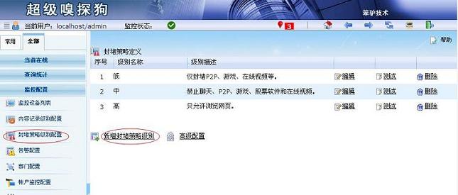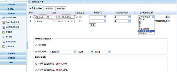 进入到监控配置 -- 网段封堵策略,点击新增,输入想要封堵的网段如:192.168.1.160-192.168.1.170 ,封堵级别选择新增的“公司官网通知”。