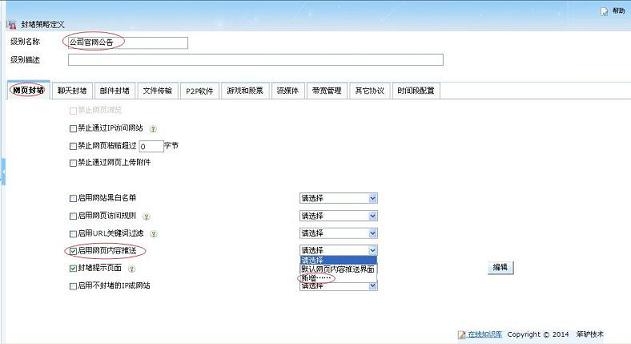 输入级别名称以及级别描述,(如:公司官网通知),选中网页封堵选项卡,选择“启用网页推送” ,点击新增。