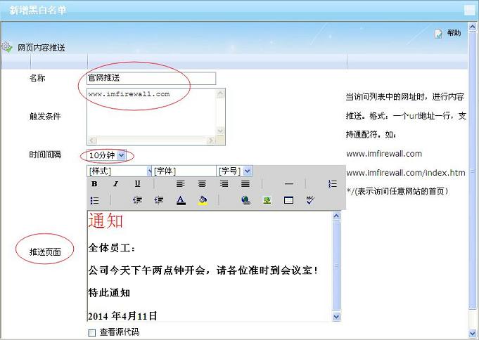 输入名称:官网推送,触发条件:www.imfirewall.com ,时间间隔选择:10分钟,输入推送页面内容,如图。
