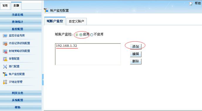在“帐户监控配置”页面中,选择“域账户监控”,点击“启用”,新增一个域控制器。