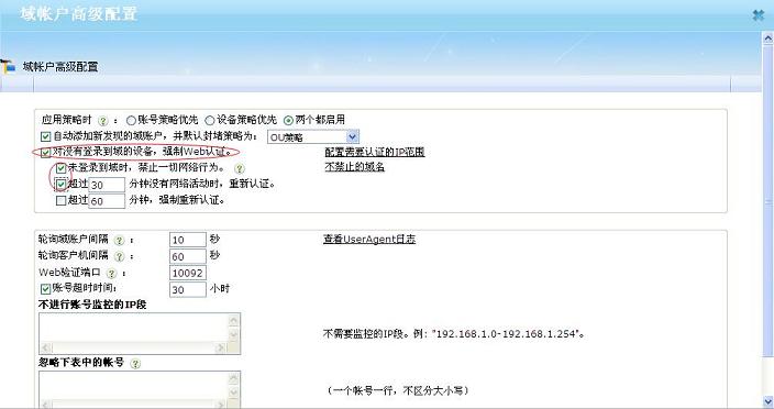 点击“高级配置”,将“对没有登录到域的设备,强制web认证”,勾选上,保存配置。根据需要,可以将“未登录到域时,禁止一切网络行为”以及“超过30 分钟没有网络活动时,重新认证 ”,勾选上。
