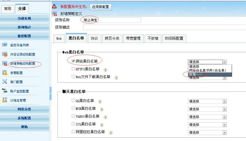 这篇文章我们将介绍如何用WFilter 4.1禁止淘宝,下面是配置的具体步骤: 1.在“监控配置-封堵策略级别配置”中新增封堵策略级别。输入名称,启用网站黑白名单并新增一个网站黑白名单,如下图所示: