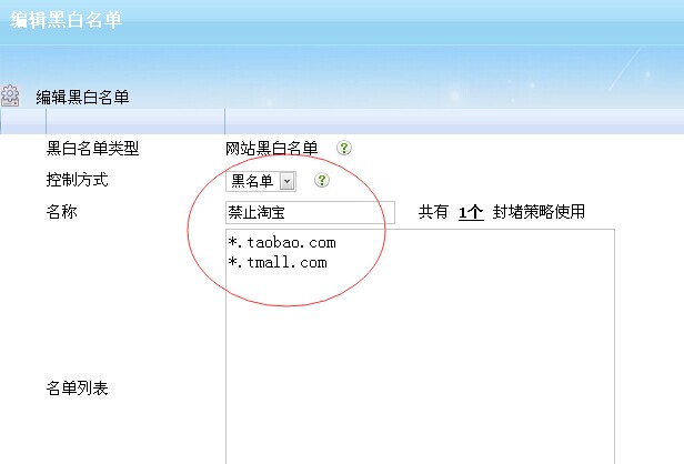 2.编辑黑白名单,控制方式为黑名单,名单列表中输入 *.taobao.com和 *.tmall.com,如下图所示: