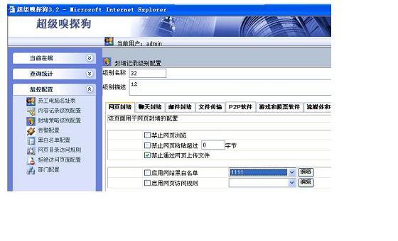 如果只是要禁止网页上传,只需选择“封堵级别策略配置”,然后选择“网页封堵”