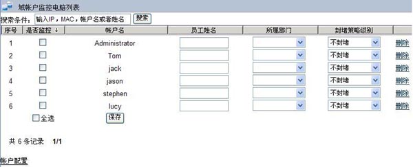 如图1.3所示,点击“保存并获取域帐户”,进入“域帐户监控列表”页面,可以对列表中的帐户指定不同的上网策略。