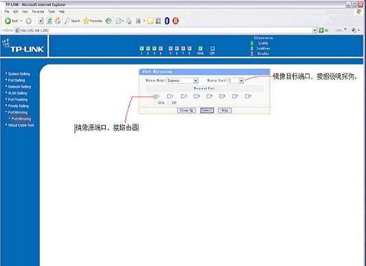 某网络环境如下图,ADSL接入到linksys宽带路由器(BEFSR41), 然后通过“cisco无线AP”(Cisco 1200)搭建一无线局域网环境。 局域网内既有通过无线上网的机器,又有有线上网的机器。 在本例中,为了能同时对有线环境的机器和无线环境的机器进行监控。我们增加了一个 TPLINK的镜像交换机(TL-SL2210WEB)。如上图中框内部分。 tplink镜像交换机的设置如下图: 通过上述设置后,即可监控网络内的所有电脑的上网行为。