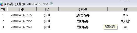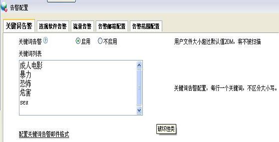 内容告警:设置相关关键字或者词,一旦有聊天内容触及到相关关键字,系统将自动发出告警邮件到指定邮箱。