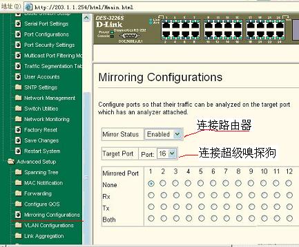 在本例中,直接在dlink2366上做端口镜像即可,dlink2366端口镜像的配置如下图: