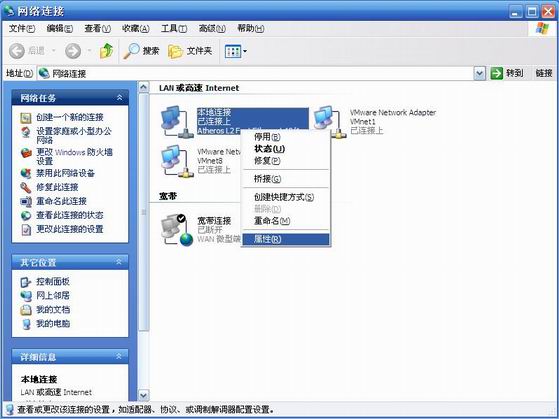 首先,在“开始菜单”—“设置”中,打开网络连接面板,右击“本地连接”,选择属性。