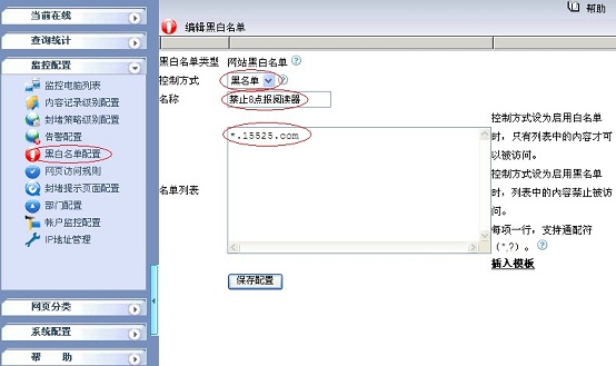2.1 在“监控配置 -> 黑白名单配置”新增一个网站黑白名单,控制方式为黑名单,名称为禁止8点报阅读器,如下图所示: