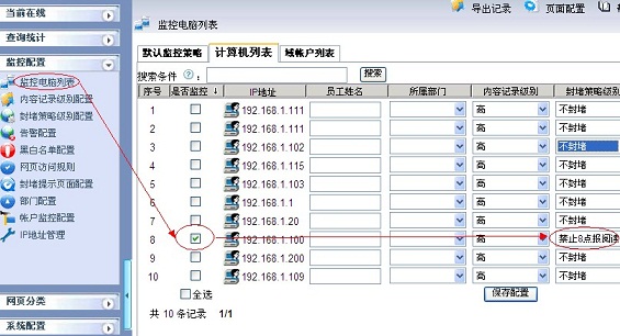 2.3 在“监控配置->监控电脑列表”里,选择要封堵的主机和策略,保存配置,应用封堵策略,如下图所示: