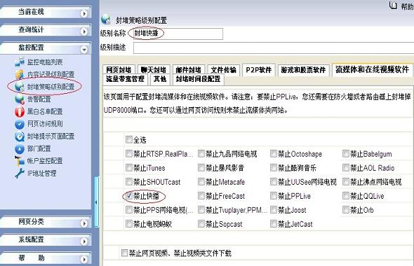 2.2 在“监控配置->封堵策略级别配置”新增一个“ 新增级别”,级别名称为禁止快播(Qvod)。在“流媒体和在线视频软件”标签下选中“禁止快播”的复选框点击保存,如下图所示: